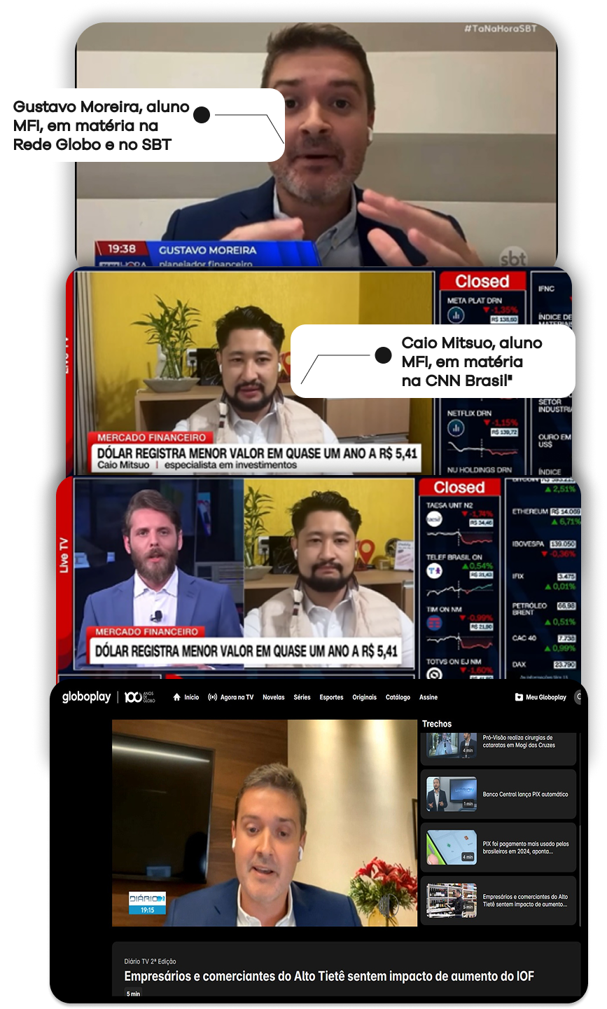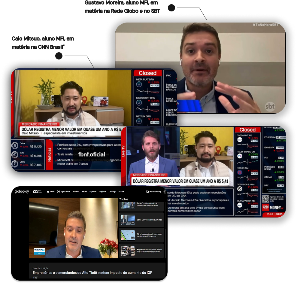 O MFI conecta você a mentores internacionais, profissionais de destaque e oportunidades reais nos mercados onshore e offshore, além de te colocar em uma comunidade de alunos com alta bagagem no mercado financeiro. Um ecossistema pensado para acelerar sua carreira e expandir sua atuação global.